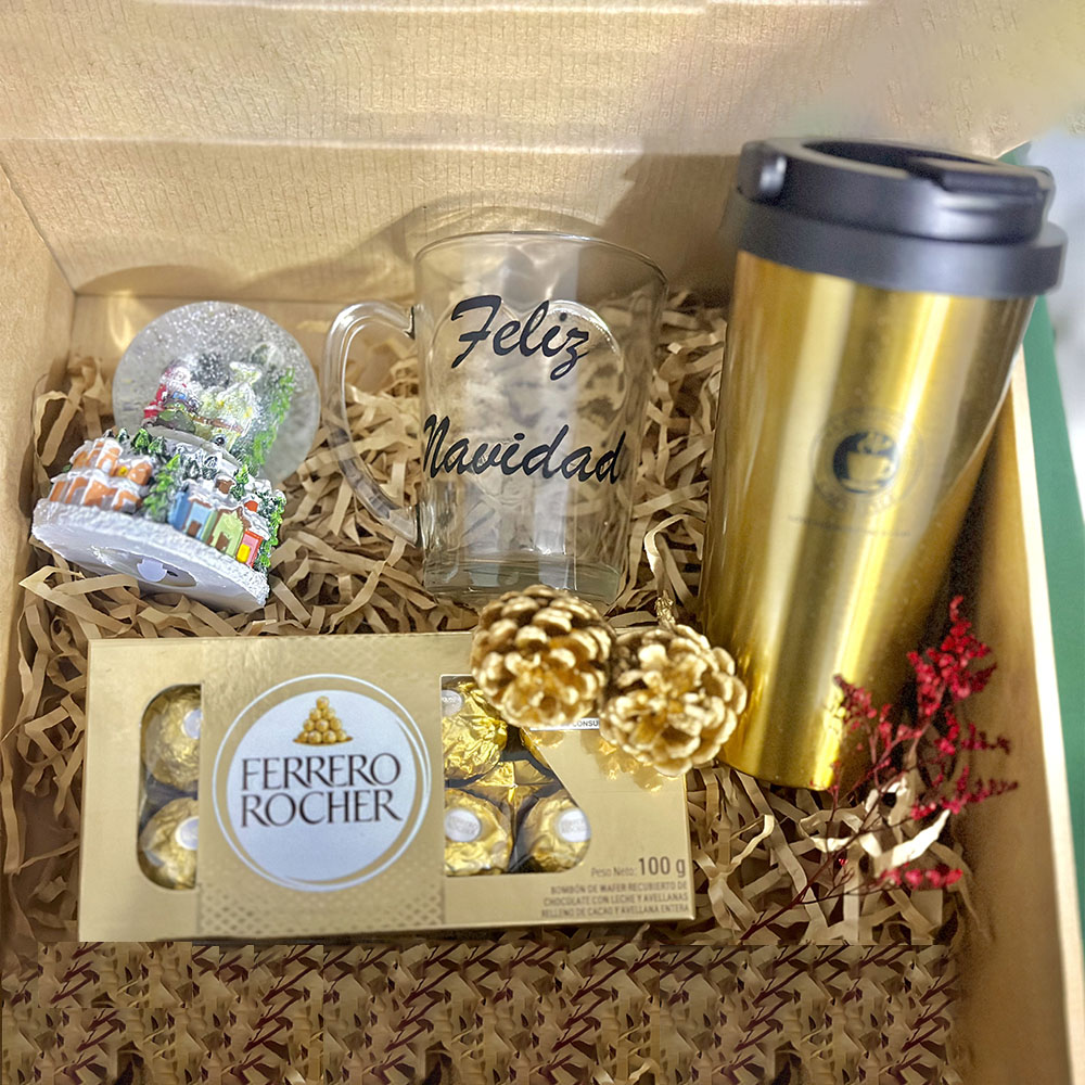 Incluye: 01 Cajita de Ferrero Rocher de 8 unidades 01 Adorno navideño 01 tasa transparente 01 tomatodo 02 piña dorada decorativa Plantita decorativa Incluye tarjeta personalizada