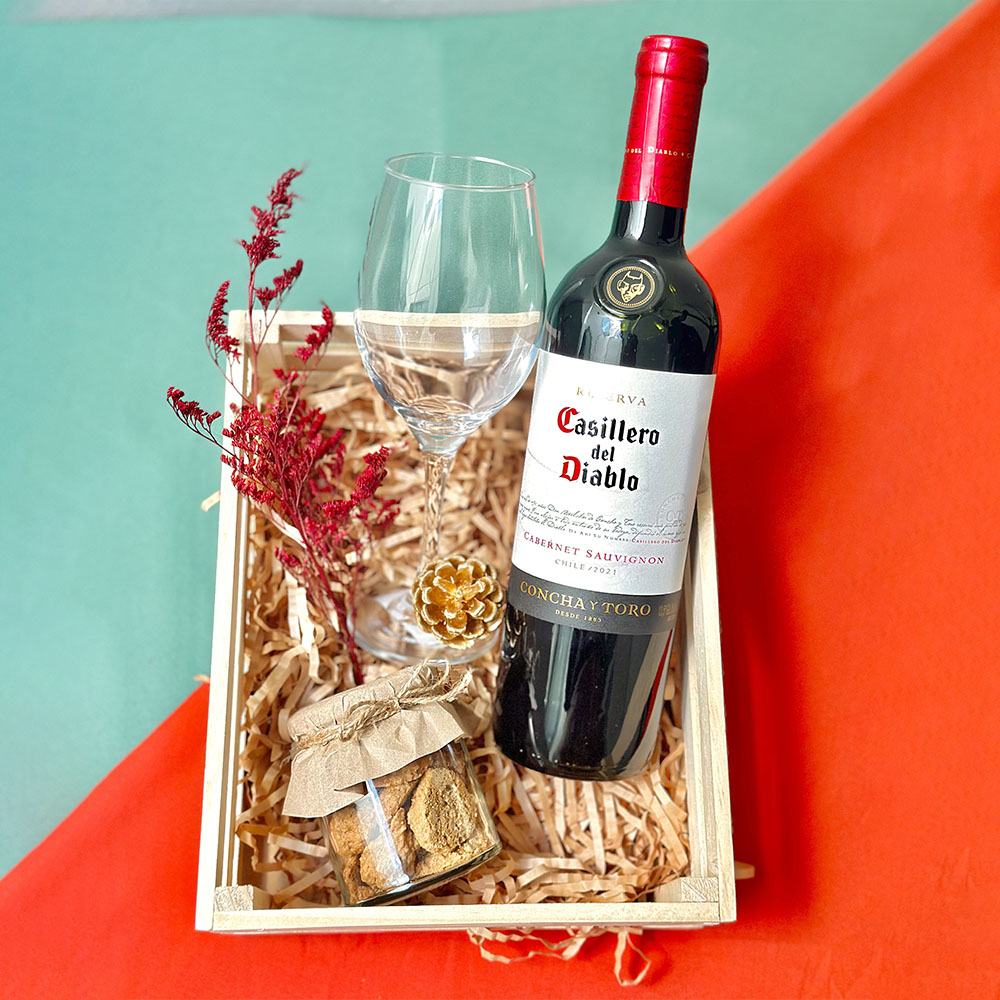 Incluye: 01 Vino Casillero del diablo 750ml 01 frasco de Galletas de avena 01 Copa 01 piña dorada decorativa Plantita decorativa Incluye tarjeta personalizada